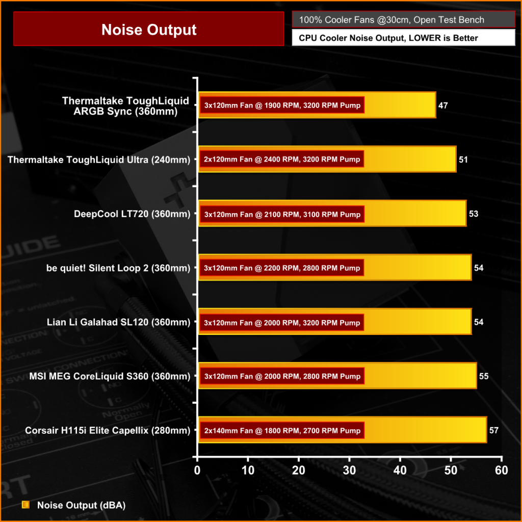 With fans running at their maximum RPM, the DeepCool LT720 sits somewhere in the middle of our results at 53dBA noise output. As far as 360mm coolers go it’s relatively loud but not too distracting. Compared with other units from the likes of be quiet!, Lian Li and MSI, the LT720 it is marginally quieter but Thermaltake’s Toughliquid ARGB Sync is significantly quieter at maximum RPM.