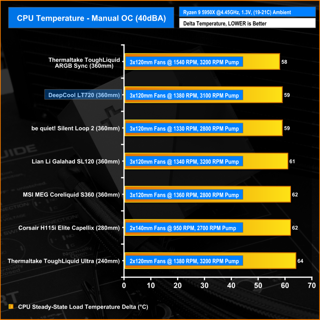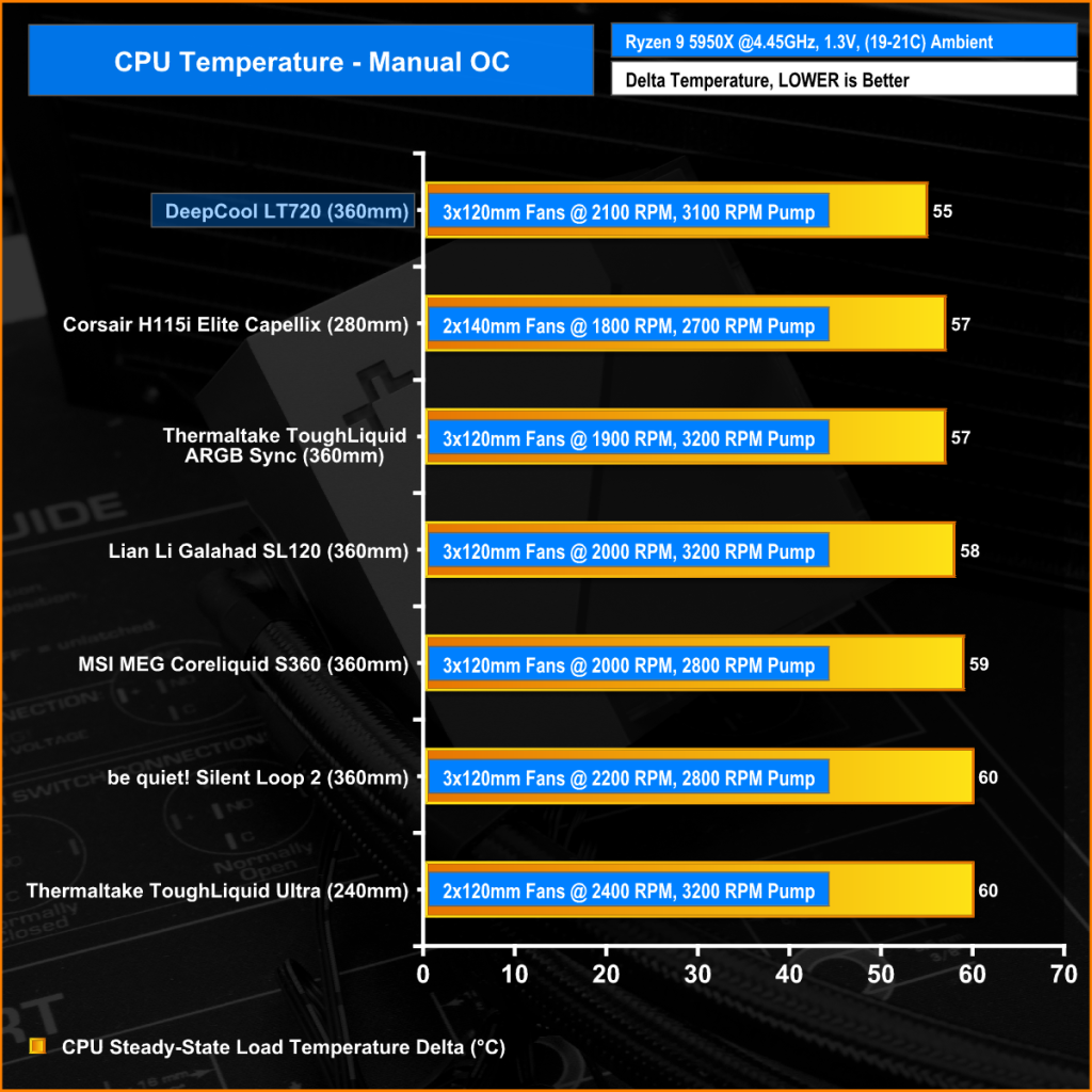 DeepCool has tuned its fans to offer high raw thermal performance levels, with fans at maximum RPM the DeepCool LT720 cooled our manually overclocked 5950X to a delta of 55 degrees which is an outstanding result and beats off competition from the likes of MSI, Thermaltake and be quiet! 360mm coolers.