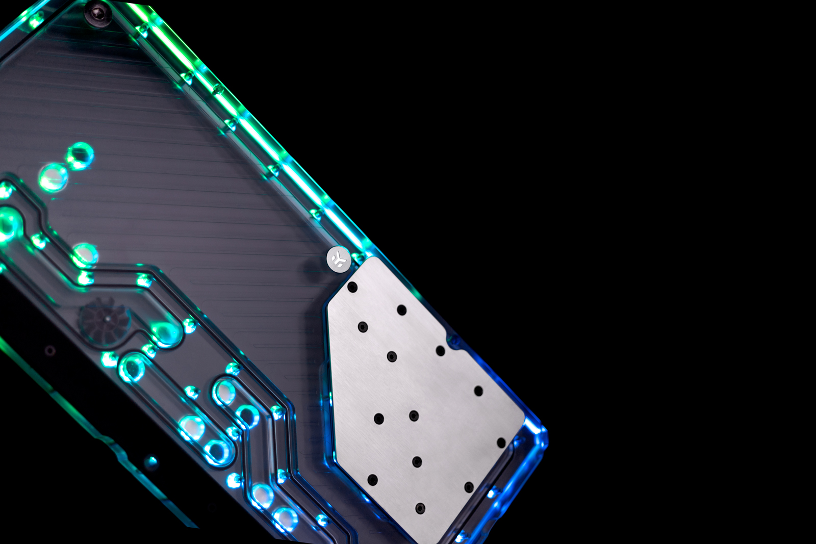 Since the EK-Quantum Reflection PC-O11D D5 PWM D-RGB is designed to be installed at the front of the case, it has been outfitted with the flow indicator as well as an addressable D-RGB lighting strip that runs down the entire length of the distro plate, with an anodised aluminium cover hiding away unsightly light bleed from the individual LEDs. There is a total of 23 addressable RGB LEDs built into the plate that can be configured and synchronised via the motherboard 5V 3-pin header.