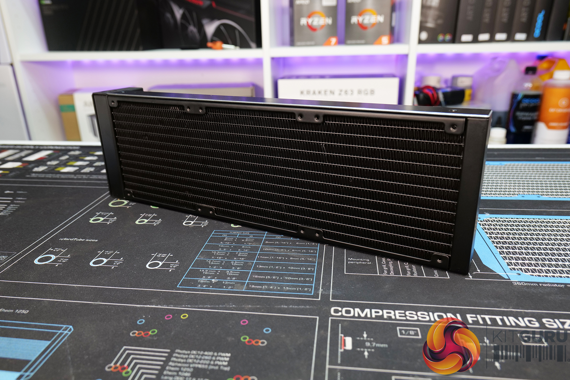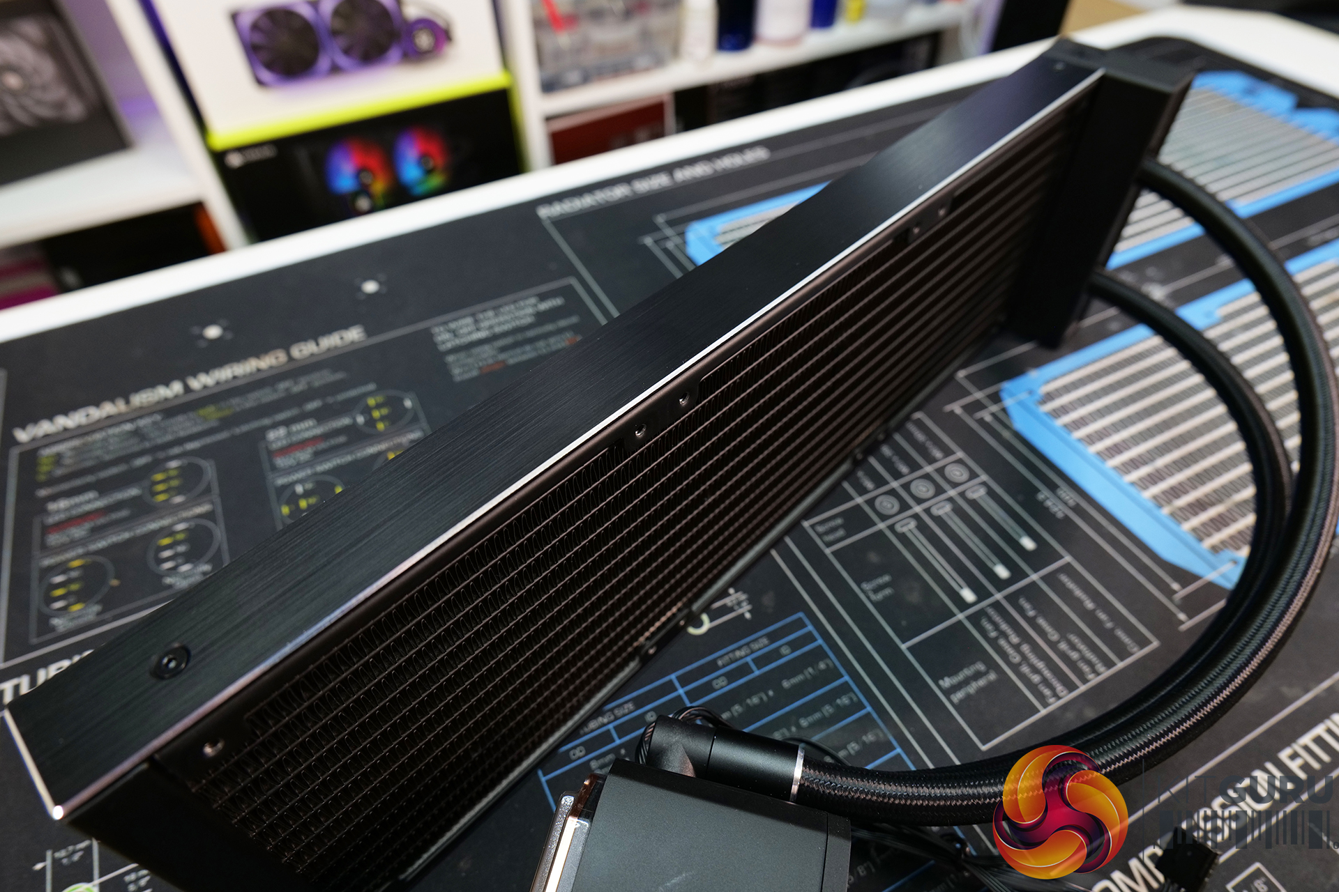 EK's latest Surface radiators for custom cooling use copper cores of various thicknesses. With the EK-Nucleus AIO the company has chosen an aluminium radiator design which is common with AIO CPU coolers as it keeps cost down. The radiator is a standard 27mm thick unit with an overall length of 400mm and width of 127mm coated in a satin black finish. EK has added some brushed aluminium trim panels to either side of the radiator to enhance aesthetics.