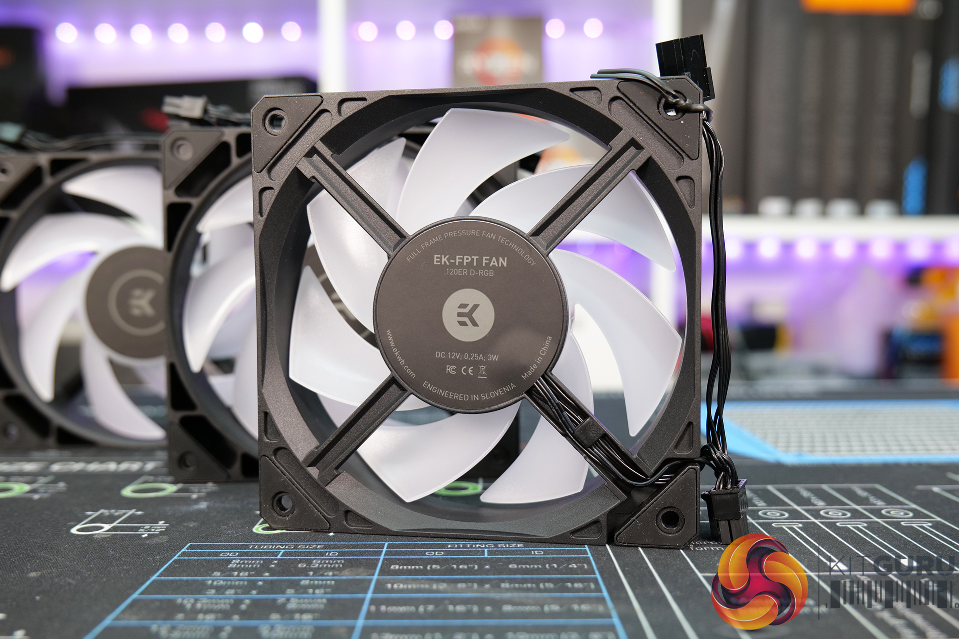 EK FPT are high static pressure fans with a full frame design for better radiator contact to reduce air escaping around the side of the frame. They are equipped with anti-vibration rubber mountings, fluid dynamic bearings and a seven-blade impeller with nine hub-mounted D-RGB LED’s. They have a PWM speed range of 550 – 2300 RPM, maximum static pressure of 77,000CFM, a static pressure of 2.7mm H2O and a maximum noise level of 36dBA.