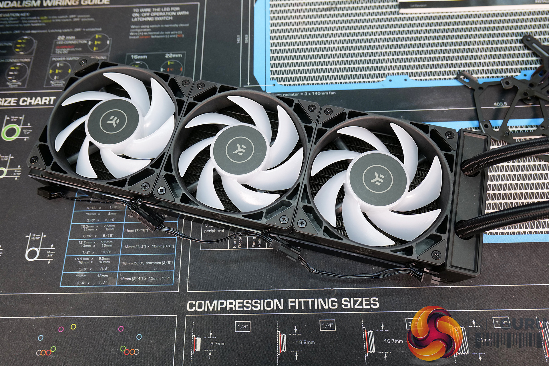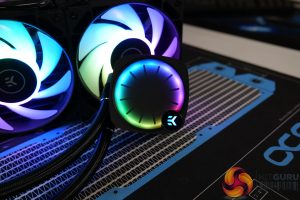 There are two zones of RGB lighting on the EK-Nucleus AIO, on the fans and on top of the CPU block. The effects are controlled by motherboard software or a standalone RGB hub, so whatever effects are supported by the software or hub will be applied to the cooler.