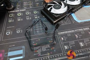 To complete the installation, connect the wiring up to the motherboard. The 4-pin PMW cable from the fans can be connected to the motherboard CPU_FAN header and connect the pump PWM cable to the motherboard CPU_OPT header. The 3-pin D-RGB cables from the fans and pump can be daisy-chained and then the female end connector plugged into a 3-pin 5V D-RGB header either on the motherboard or a standalone RGB hub.