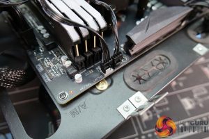 Attach the AMD upper mounting bracket to the base of the pump using the provided screws. The CPU block cold plate comes with a thermal compound coating pre-applied so there’s no need to put extra thermal compound on the CPU. Lower the CPU block down over the standoffs and tighten the block in place using the four spring-loaded thumbscrews.