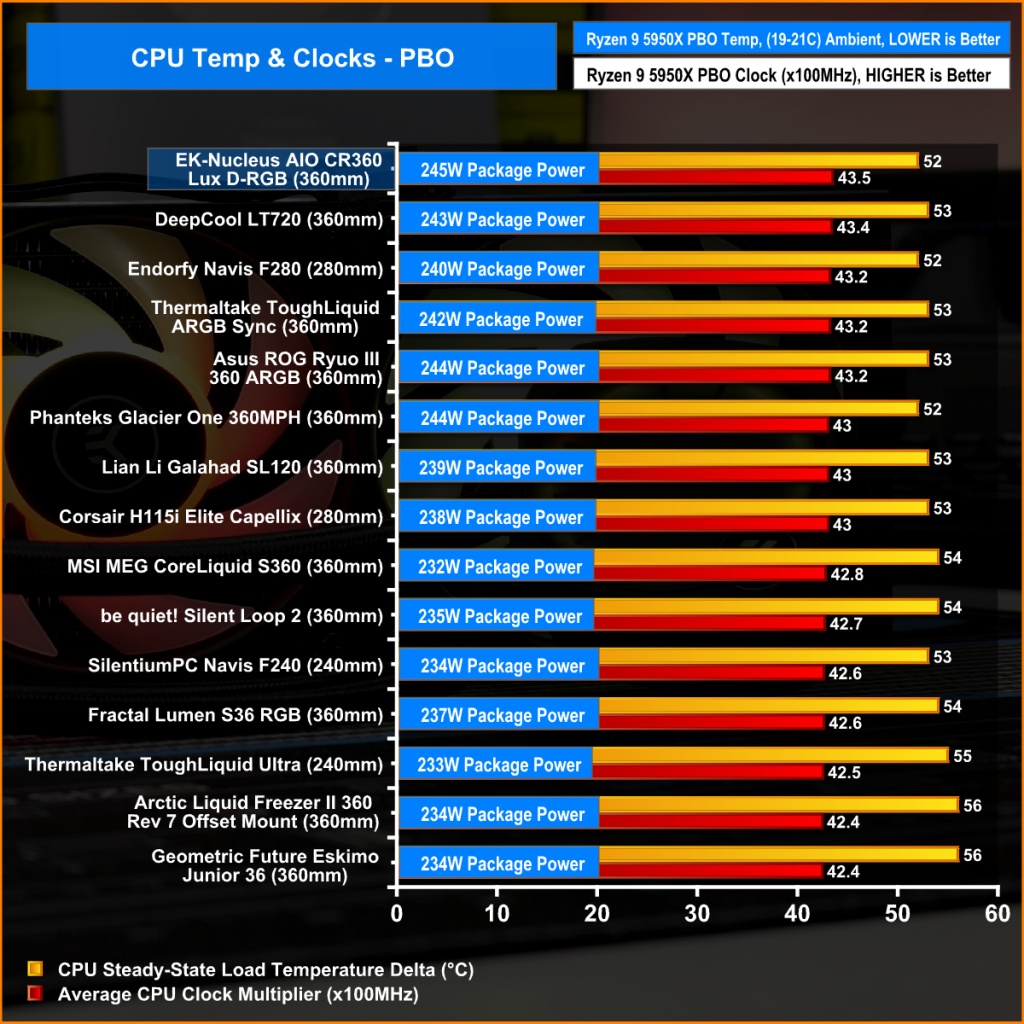 The Nucleus CR360 tops the charts again with an impressive 43.5 X average clock multiplier and handling 245W of package power. Overall it's an excellent result for the EK-Nucleus.