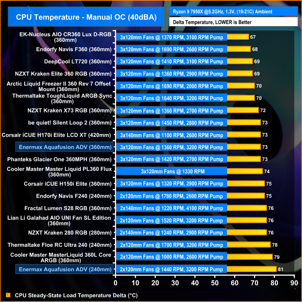 Tuning fan speed down to 40dBA noise output reduces the thermal performance of the 360mm Aquafusion only slightly, so it retains its middle-of-the-road performance but the 240mm unit is affected significantly by the reduction in fan RPM and thermal performance on the 7950X drops off the cliff with an average delta of 81°C means the actual CPU temperature hit upwards of 105°C which is at the point where the system would shut down to prevent damage to the CPU.