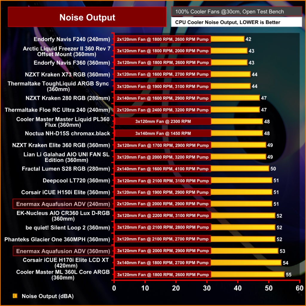 At max fan speed, the 240mm Aquafusion is towards the bottom end of the chart which is to be expected on this high-performance CPU and it seems to be performing on par with other 240mm coolers.