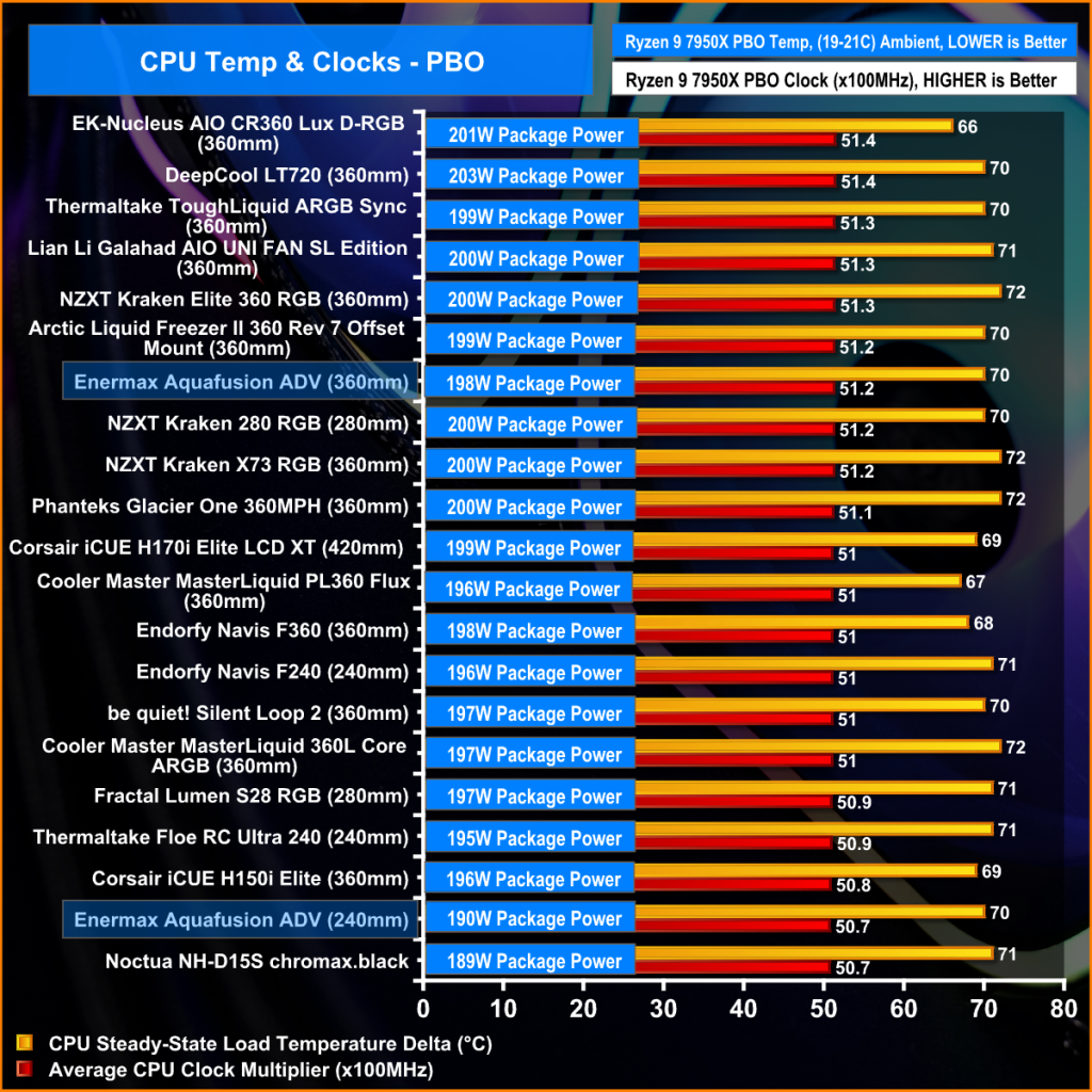 The important metric is the CPU clock multiplier. The Aquafusion 360 holds on to a 51.2x average clock multiplier while cooling just under 200W of package power which is solid performance. With fans at maximum RPM in the PBO test the Aquafusion 240 performance is again trading blows with other coolers with an average clock multiplier of 50.7x, however some similar-priced coolers are still outperforming the Aquafusion 240 by a few hundred MHz clock speed which means CPU performance is lost.