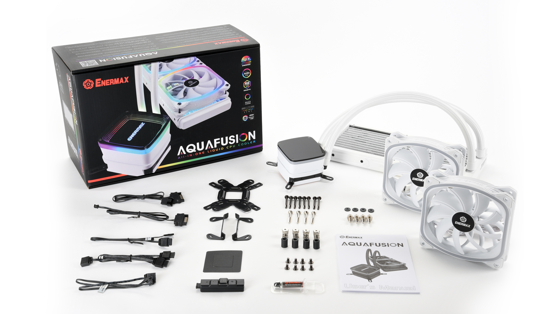 Enermax has provided mounting hardware to install the Aquafusion White 240 on all current Intel and AMD desktop CPU platforms excluding TR4/SP3, with a spring mounting system that evenly distributes pressure over the CPU HIS for even heat distribution. Enermax includes Dow-Corning thermal compound with the AIO and radiator installation is compatible with standard 120mm fan mounts.