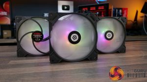 Another feature of the Silent Flow 140mm fans is ARGB lighting. Beneath the fan hubs are RGB LEDs that illuminate the fan blades. The ARGB lighting can be customised by the included Enermax controller or synchronised via motherboard software.