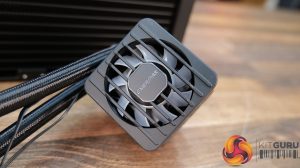 Rotary 90° fittings enter the CPU block on one side, the tubing is covered with braided sleeving which is common in almost all AIO coolers now and on top of the CPU block is a 60 x 60 mm VRM fan with speed up to 3000RPM, designed to cool motherboard components surrounding the CPU. CPU block connections include 4-pin PWM and 3-pin 5V ARGB.