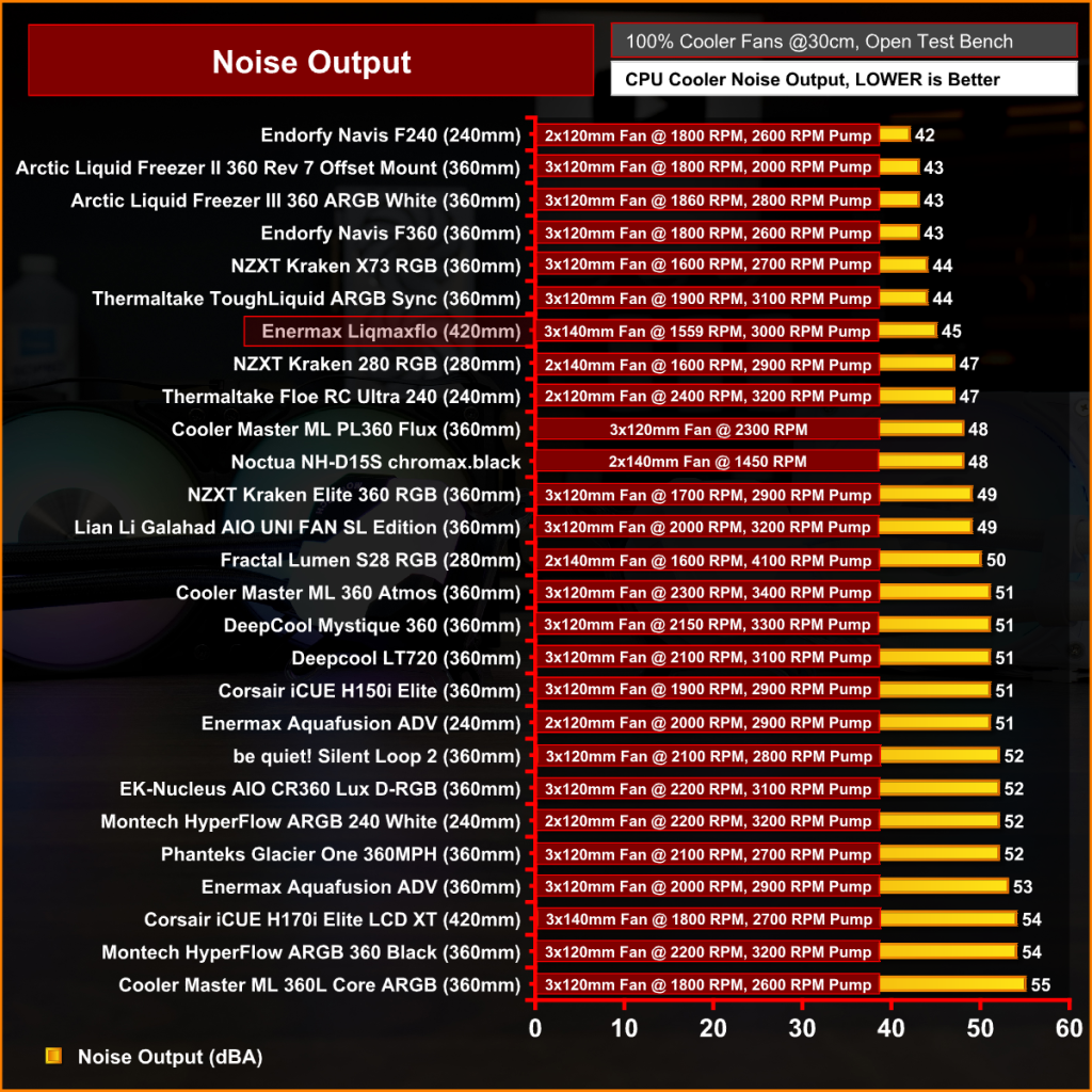 Reducing fan speed to hit the 40dBA max target only slightly affects the Liqmaxflo 420’s thermal performance. With that huge 420mm radiator it can keep up with the top-performing coolers that we have previously tested, so far it's looking good for the Liqmaxflo 420.