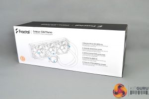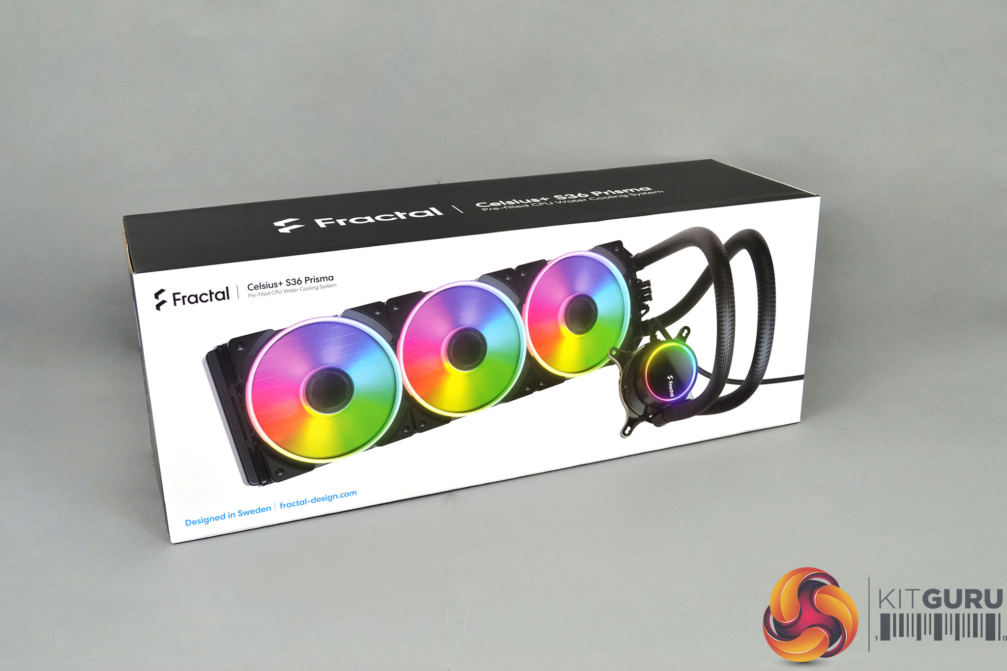Fractal Design has packaged the Celsius+ S36 Prisma series in a cardboard outer box with an internal cardboard crate offering additional protection. On the front of the box is a large image of the cooler and Fractal Celsius+ decals. On the rear is a drawing of the cooler with some key features listed to the right.
