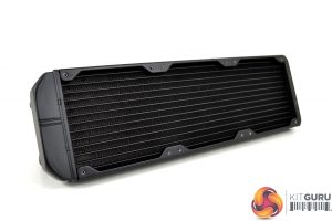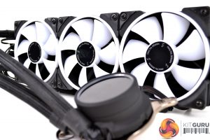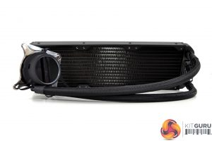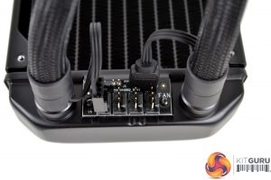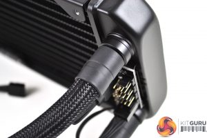 The radiator design is typical of a Gen 6 Asetek product with visible rivets along the top and bottom fan mounting brackets, the whole unit is covered with a smooth and even black coating. Located towards the end of the radiator where the tubing connects is the fan/RGB hub. The pump cable is pre-connected to the hub and there are three headers for fan connections and a single 3-pin RGB header.