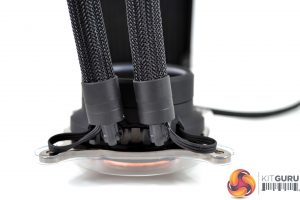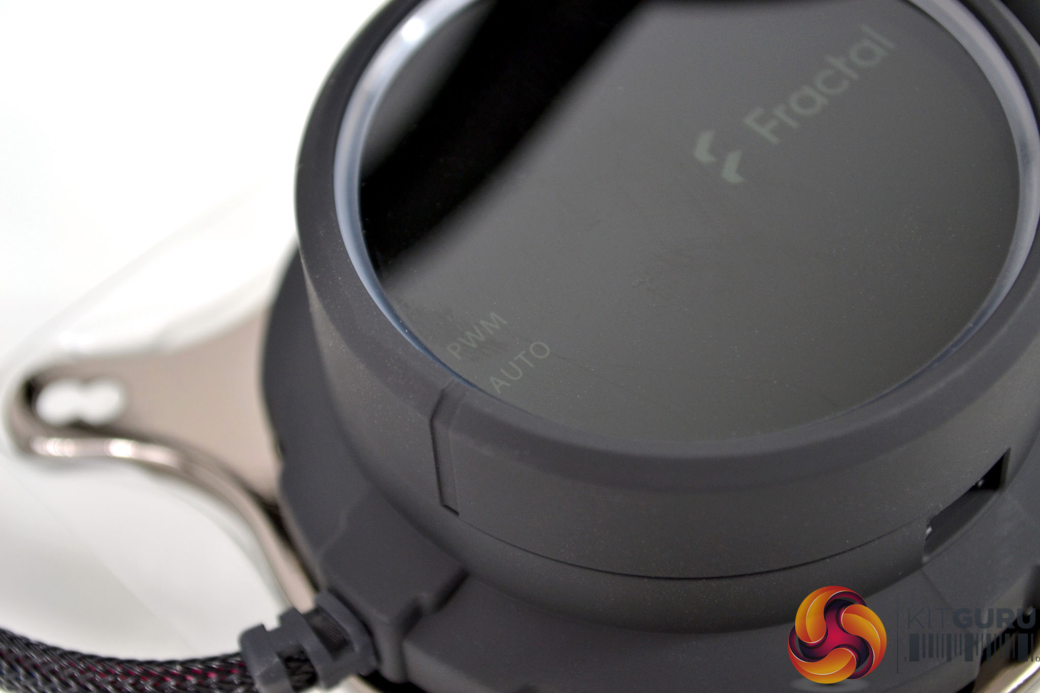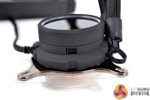 The pump housing is constructed from a matte black plastic that feels very high quality, with a top section that is used to switch between auto and PWM fan control. Wiring from the radiator mounted fan/RGB hub passes through the tube sleeving and connects to the pump unit. A single 4-pin fan cable is permanently fixed to the pump housing and there is a 3-pin RGB socket to connect to the motherboard using the supplied extension lead.