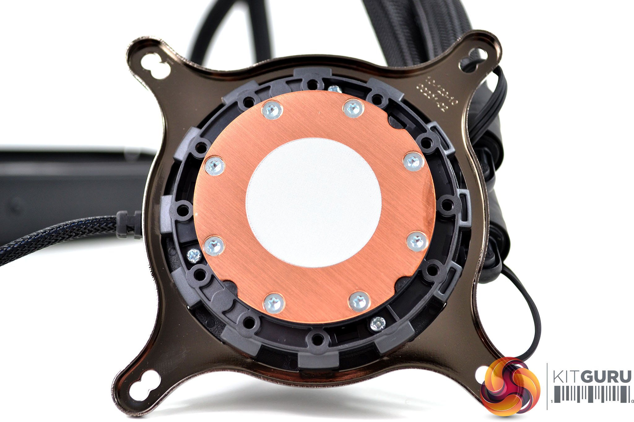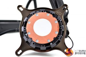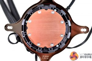 The base of the CPU block is fitted with a CNC machined quality copper cold plate with a typical Asetek circular design, machining marks are visible but not deep. A generous amount of thermal compound has been pre-applied at the factory, However, if you intend on using this cooler with AMD TR4 processors we would suggest adding a little more thermal compound as the factory-applied isn’t always enough for this situation.