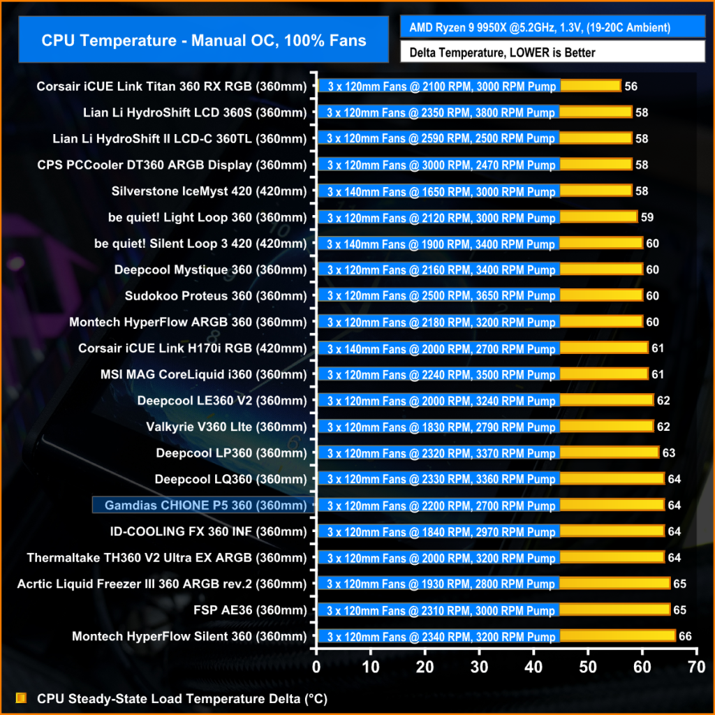In the PBO test the important metric is clock multiplier as the CPU frequency is automatically adjusted to meet a target temperature so the dalta between coolers is narrow. It's not a bad showing from the Gamdias CHIONE P5 360 in the PBO test, it's trading blows with the competition by maintaining an average 52.4x clock multiplier, which is a decent result from this lesser-known brand.