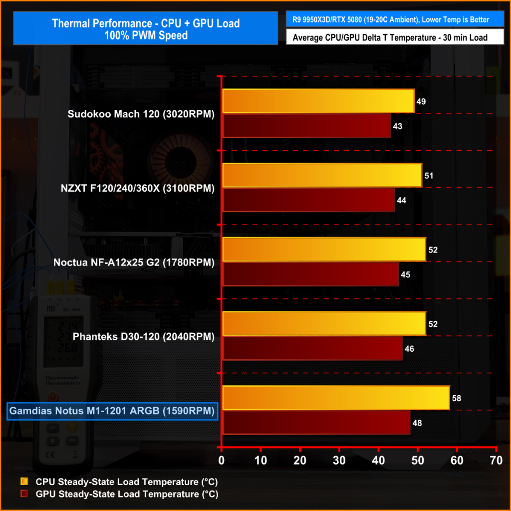 At maximum speed, the Notus M1-1201 ARGB runs the system hotter than the higher RPM rivals, hitting 58°C over ambient on the CPU and 48°C on the GPU. It trails the Sudokoo, NZXT, Noctua, and Phanteks fans by a few degrees, showing that it’s not the strongest performer in raw cooling. The trade-off for lower RPM and quieter operation pushes CPU temperature noticeably higher but still within an acceptable range.