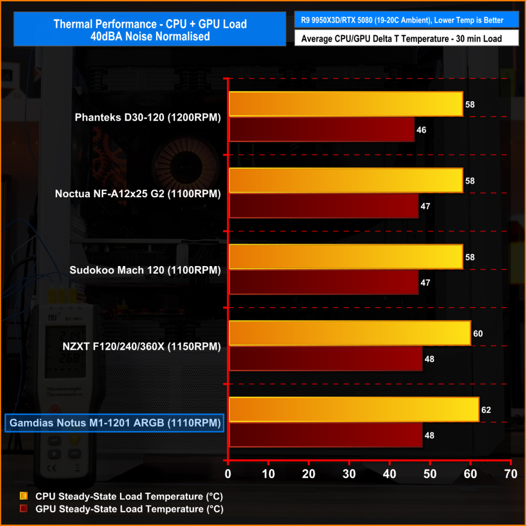 Notus M1-1201 ARGB runs a little warmer than most of the other fans at 40 dBA noise normalised, with CPU temperature at 62°C and GPU temperature at 48°C over ambient. It's just a few degrees behind the Phanteks, Noctua, and Sudokoo fans, which all manage 58/47°C and slightly higher than the NZXT F120 series. While it’s not the coolest option in 40 dBA tests, the temperatures remain within a safe range, showing the Notus M1 can keep both CPU and GPU temperature controlled at low noise levels.