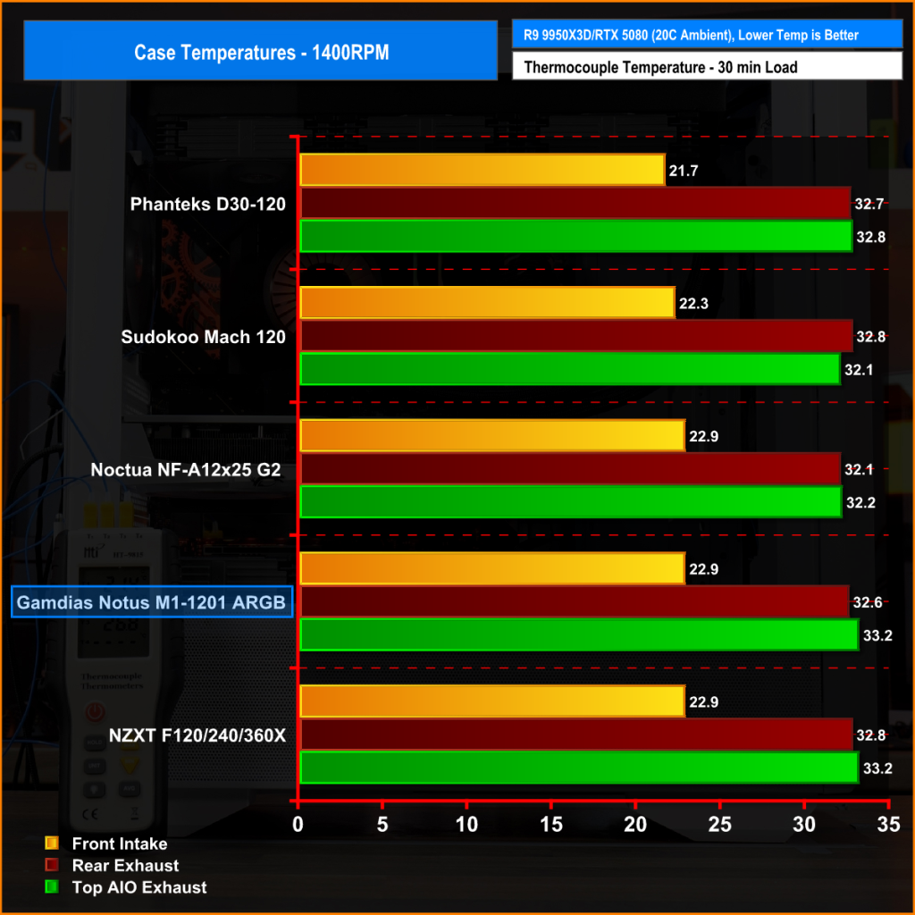 At 1400 RPM, the Notus M1-1201 ARGB delivers solid numbers, almost identical to the more expensive NZXT F Series X. Front intake is at 22.9°C, matching Noctua, while rear exhaust and top AIO exhaust temperatures are a bit higher at 32.6°C and 33.2°C, respectively. At 1400 RPM it stays close to the other fans and shows that even at normalised speeds, it can keep a system reasonably cool, however the Notus M1 has the highest noise at 1400 RPM.
