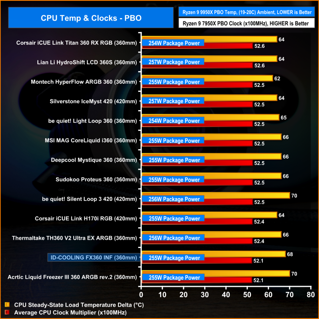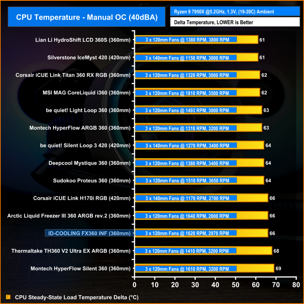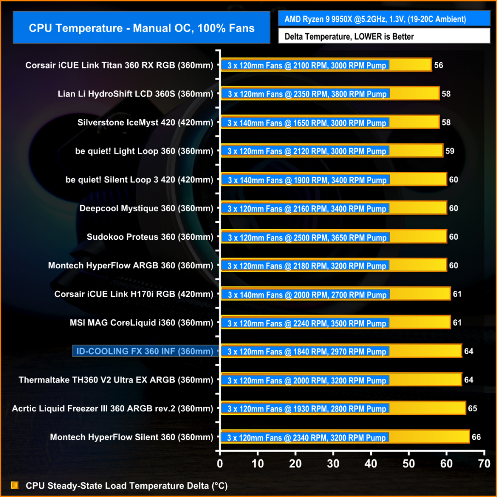 In our first manual OC test, the coolers are running with fans and pump speed maxed out. The ID-Cooling FX360 INF manages OK CPU temperature at this point, there's no sign of overheating but it's quite low in the chart with an average load temperature of 64°C.