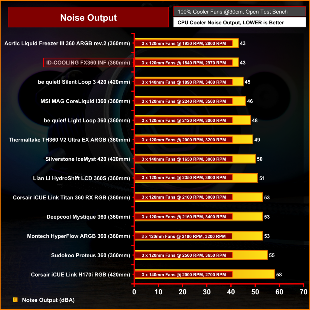 In the noise normalised test, all cooler fan speeds are reduced to hit a maximum noise output of 40dBA. To reach the 40dBA limit, the FX360 INF fan speed only has to be lowered by 200 rpm, so the performance isn’t affected massively.