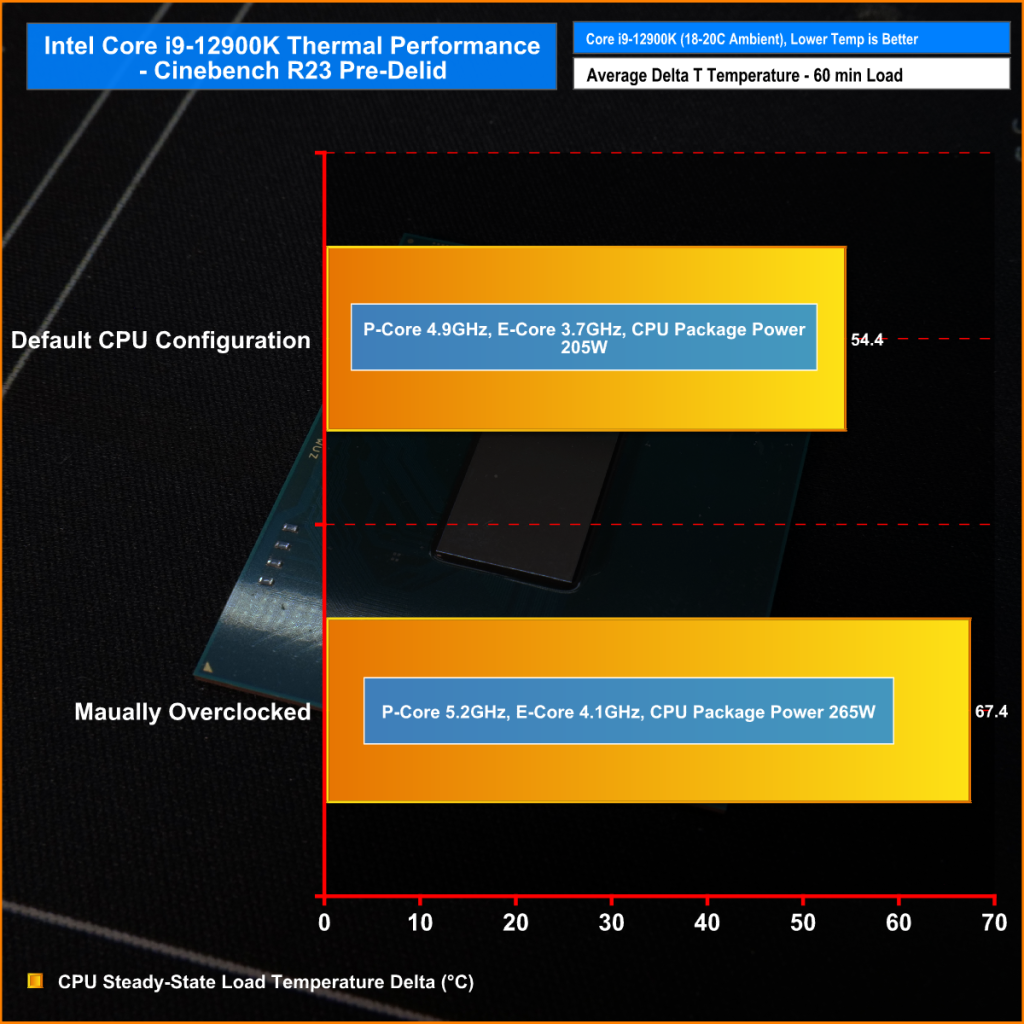 For both the intel default and overclocked thermal tests we ran Cinebench R23 multi-core stress test in a loop for one hour so that the CPU could reach steady-state temperature, we then recorded the average CPU package temperature from the final 15 minutes of the stress test. We will repeat the same thermal tests using the two saved BIOS profiles once the custom direct die water block is available from EKWB to measure improvements.