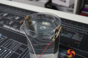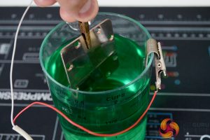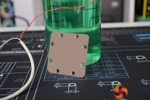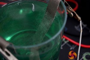 With the part clean and etched, we are now ready to begin electroplating, just like the process of making the nickel electrolyte, this stage isn’t difficult. Using one of the nickel anodes from earlier, place this back into the beaker containing the nickel electrolyte and connect up the positive wire from the power supply to the nickel anode again and connect the negative wire to the part you are electroplating.