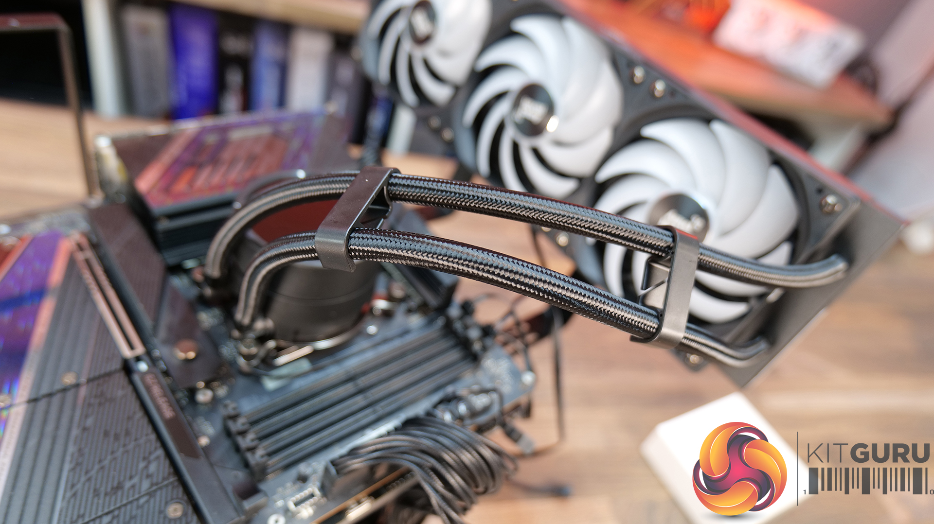 The Levelplay Combat 360 HUD uses all standard motherboard header connections, so no additional hub is required for the cooler to fully function. The radiator is mounted into the case or chassis using the provided short Philips head screws and the CPU block top cover with LCD screen can be orientated so that its display reads the correct way up. You can install the tubing clips to organise the tubing if needed.