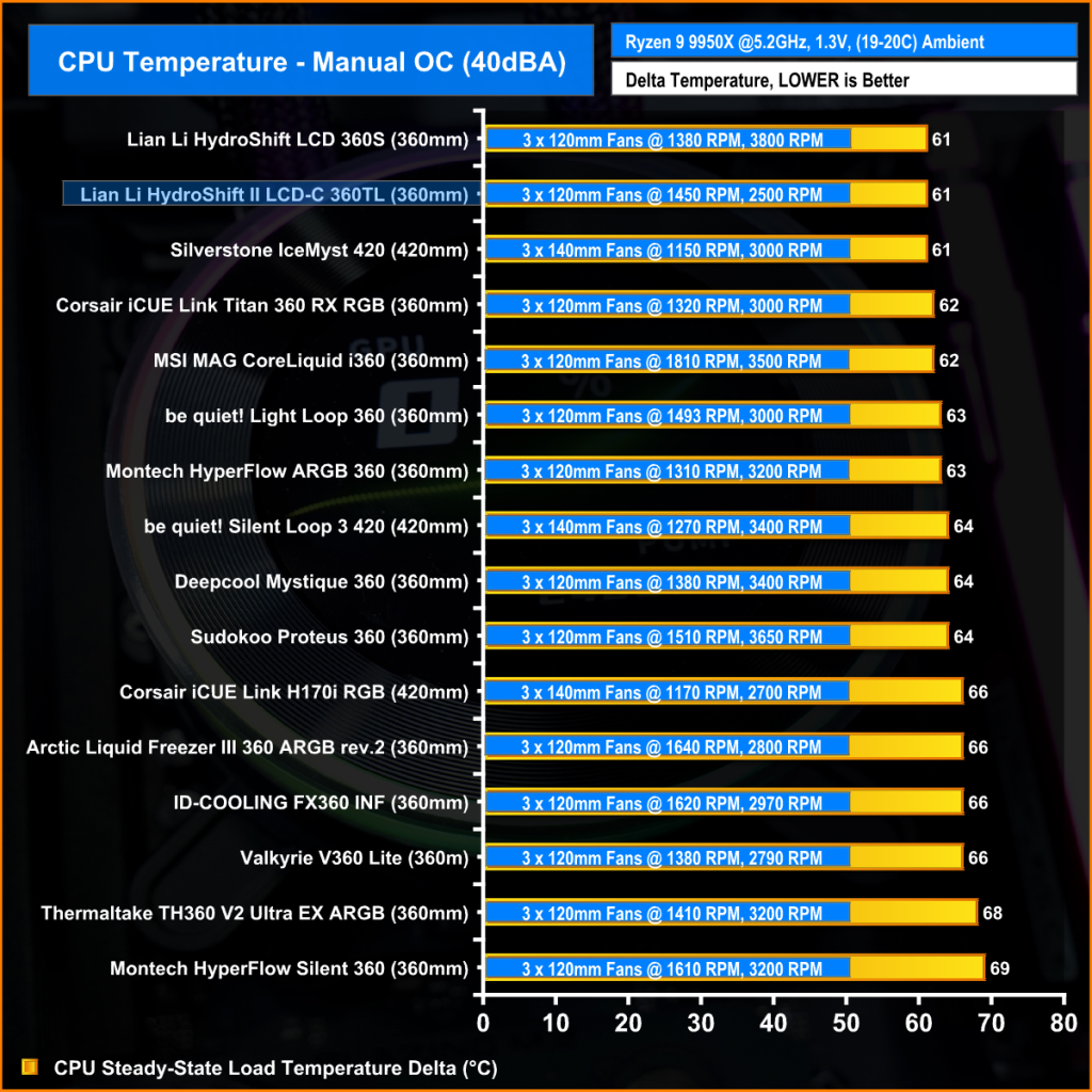 For the HydroShift II LCD to hit the 40dBA noise normalised target we had to reduce fan speed down to 1450 rpm but the cooler still hangs on with solid thermal performance at 61°C over ambient, which again equals the original HydroShift performance and is again on par with the 420mm Silverstone ICEMYST which is remarkable considering its giving up some cooling surface area against both these coolers.