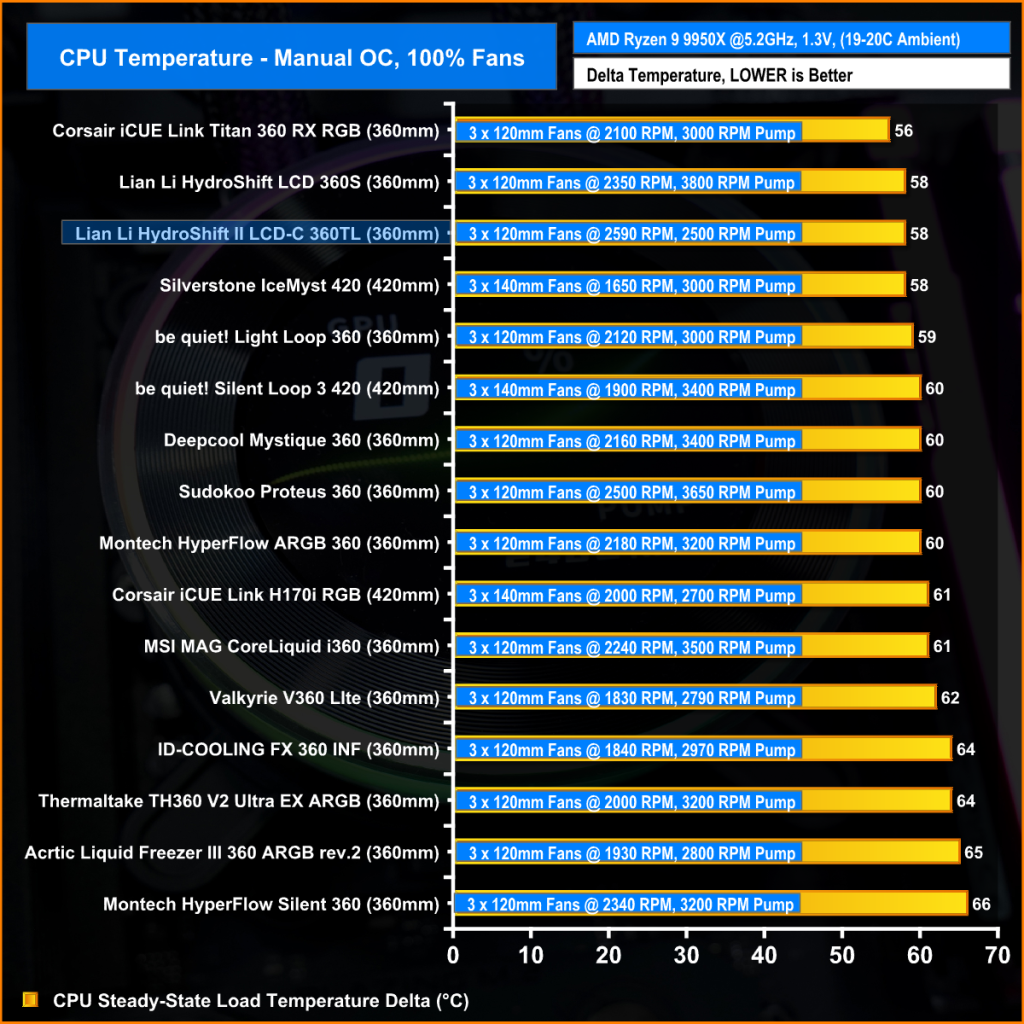 With the fans at max speed the HydroShift II LCD is trading blows with some of the top coolers we have tested so far on the 9950X. Even though it has a slimmer radiator, it still performs on par with its predecessor and is level pegging with the top-ranking 420mm AIO at 58°C over ambient average CPU temperature.