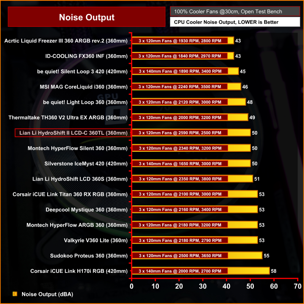 The Lian Li HydroShift II LCD is by no means a quiet cooler at 100% fan speed with a maximum noise output of 50dBA, however at almost 2600 rpm the maximum fan speed is very high and compared with other fans at similar speed the noise output of the Lian Li TL fans is quiet in comparison.