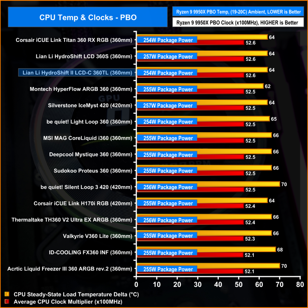 In this scenario the Lian Li HydroShift II LCD-C is again at the top end of our chart with an average clock multiplier of 52.6x while cooling over 250W package power. It matches the performance of its predecessor and outperforms the 420mm Silverstone unit. So even though the radiator dimensions have been slimmed down, there's no reduction in performance, which is very impressive.
