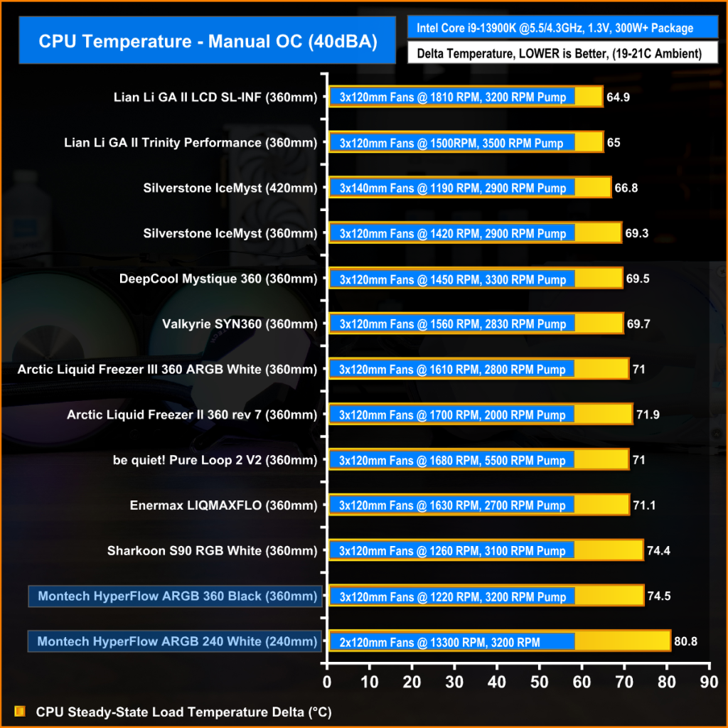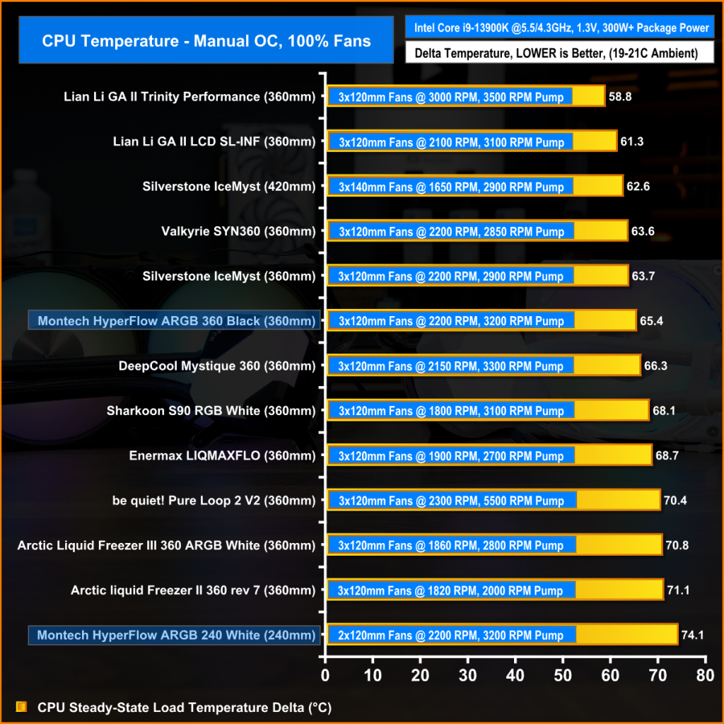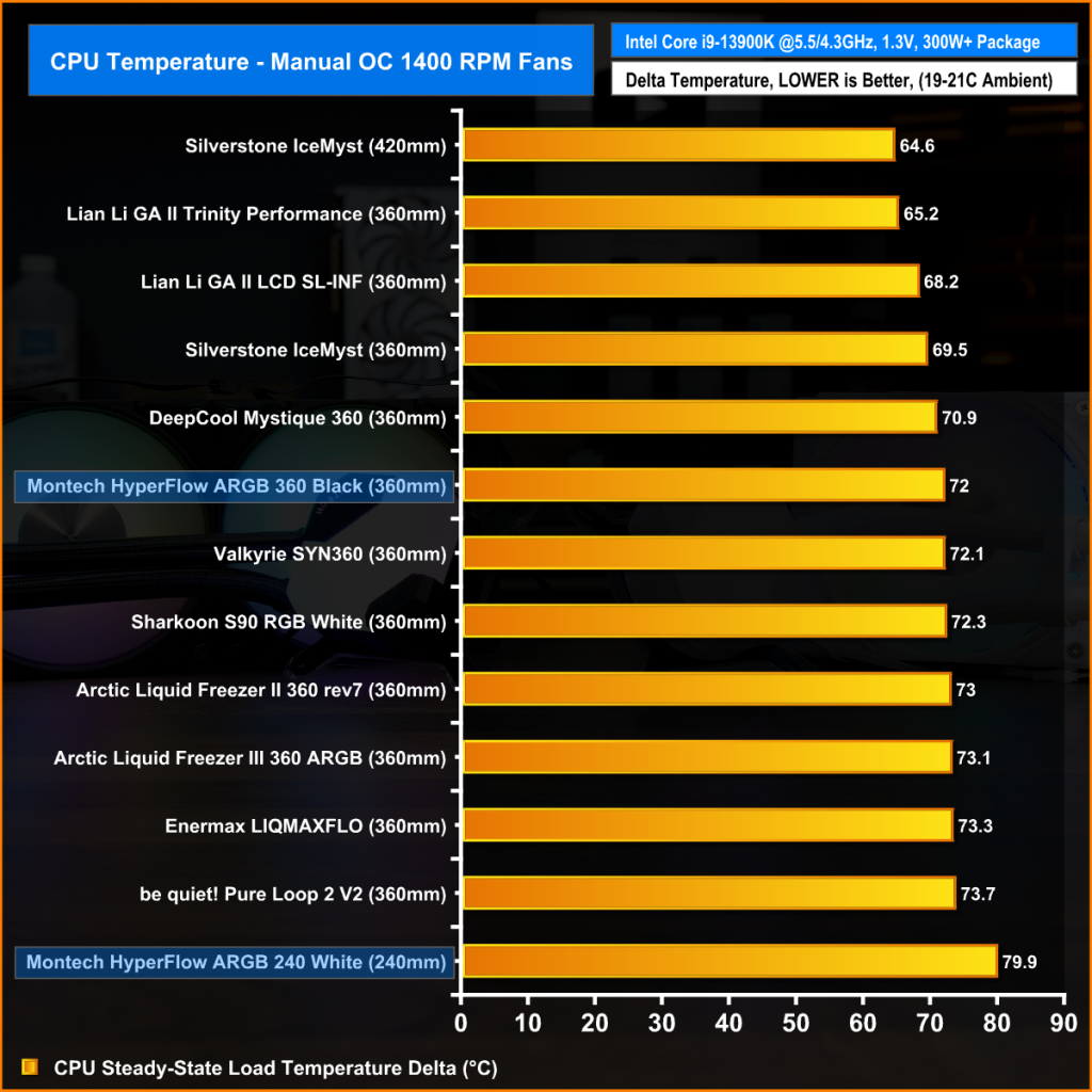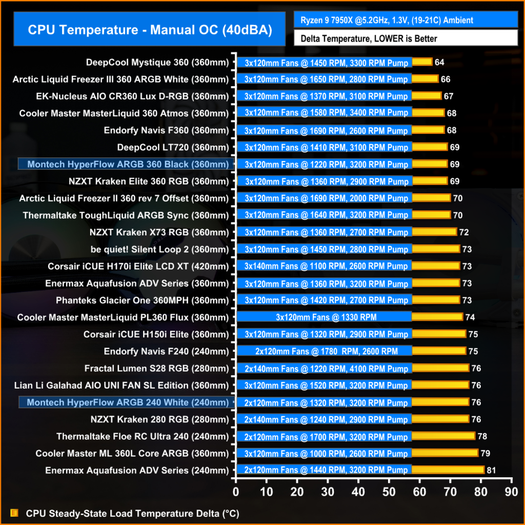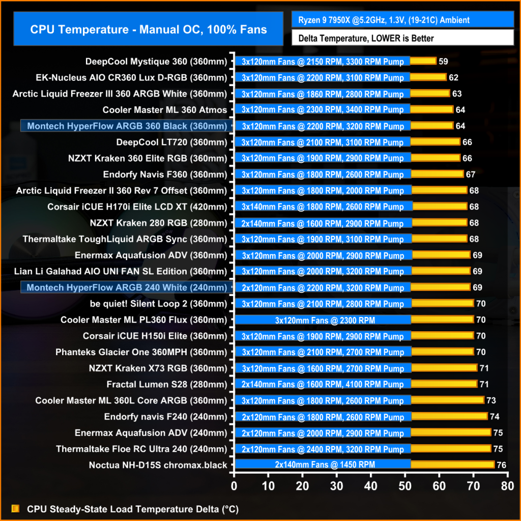 With the AMD Ryzen 9 7950X CPU manually overclocked and all cooler fans running at maximum speed, the Montech HyperFlow coolers perform excellently, keeping the average CPU temperature at 64°C over ambient for the 360 and 69°C for the 240mm.