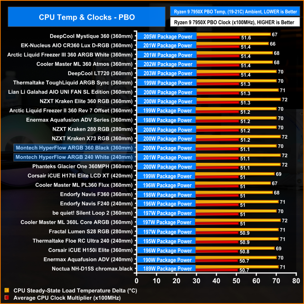 The 240mm HyperFlow does particularly well here, in fact, it’s the best PBO clock multiplier we have seen from a 240mm AIO. So overall thermal performance on the Ryzen 9 7950X is solid.