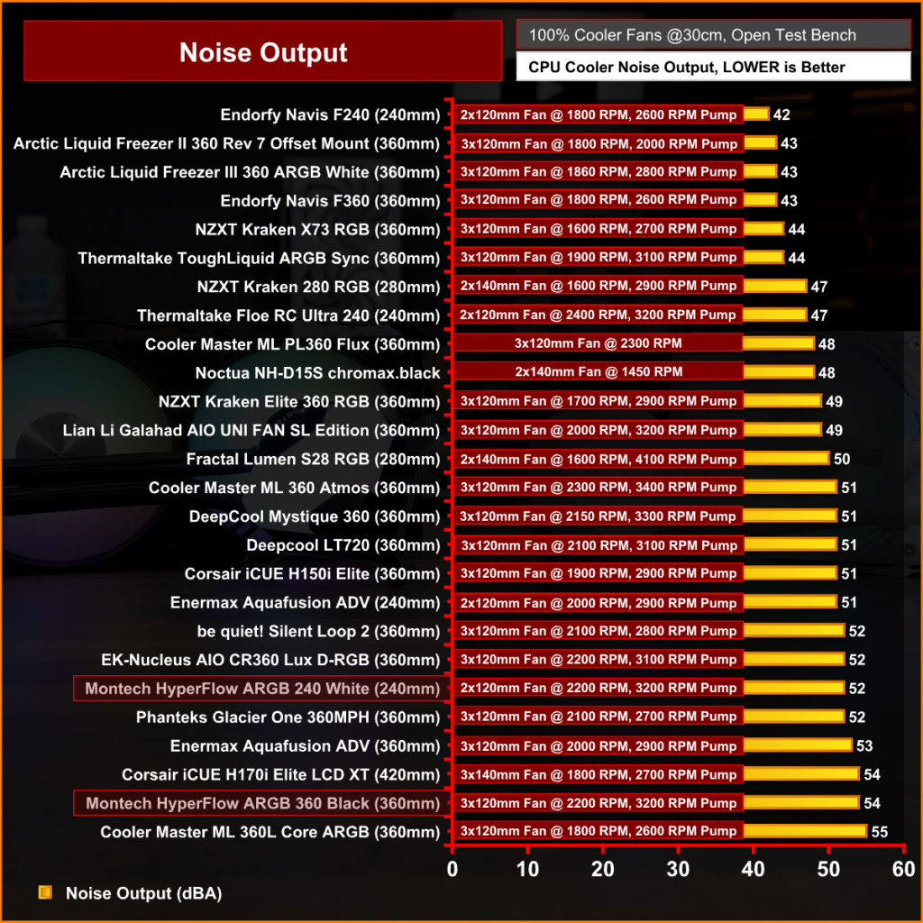 Both the 360mm and 240mm HyperFlow coolers are loud at maximum fan speed. The 360mm version will be very distracting for some at 54dBA, so tuning fan speed will be needed to get the best noise-to-thermal performance ratio for most users.
