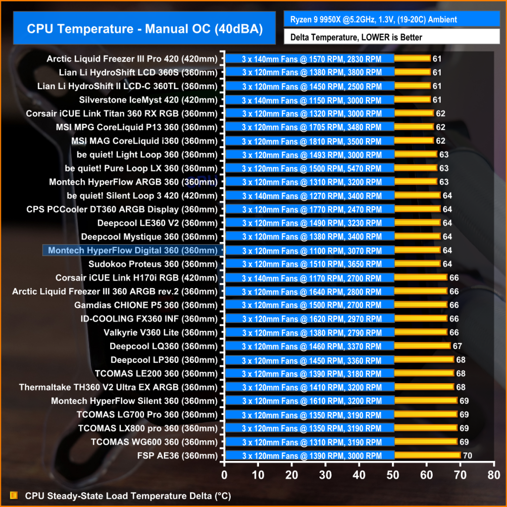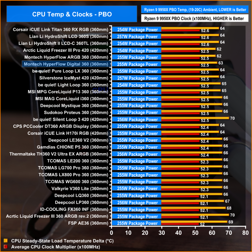 With the test running at maximum fan speed, the HyperFlow Digital performs admirably, maintaining an average clock multiplier of 52.5 while handling a 255W power package. This puts it on par with several larger 420mm coolers, though it remains considerably louder than many of them.