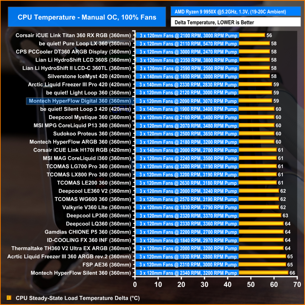 At maximum fan speed, the HyperFlow Digital delivers solid thermal performance, with an average recorded CPU temperature of 59°C. This result places it among the top-performing coolers in our testing. However, it achieves this at the cost of significantly higher noise levels compared to similarly performing coolers such as the Arctic Liquid Freezer III Pro 420 and the be quiet! Light Loop 360.
