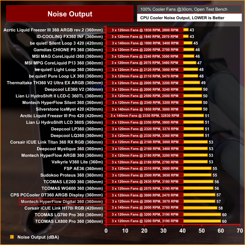 The 360mm HyperFlow Digital is exceptionally loud at maximum fan speed, producing a recorded peak noise level of 57 dBA. This places it near the bottom of our charts and makes it quite distracting to use at full speed. To achieve a more comfortable balance between noise and cooling performance, users will need to fine-tune the fan curve.