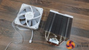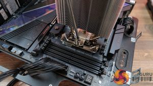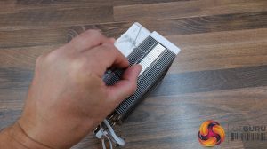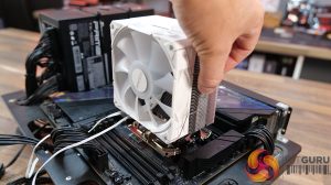 Next, clip the fan back in place. Even with tall memory modules, the fan shouldn’t interfere with the RAM, so it can be clipped in place level with the top of the cooler.
