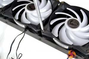 To install the MSI MAG CoreLiquid 360R on our test bench, we can first fit the fans to the radiator. To do this, place the fans in your favoured pull or push configuration on the radiator aligned with the screw holes and fix the fans in position using the twelve long nickel-plated Philips head screws provided.
