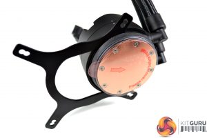 Now that the fans are fitted to the radiator, we can complete the preparation of the cooler by installing the upper mounting bracket to the CPU block. For Z390 platforms, select the Intel upper mounting bracket as shown in the installation manual, locate the bracket in the CPU block groove as show and slide it into position until it is fully engaged.