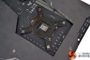 Now working from the back of the motherboard, align the backplate standoffs with the motherboard mounting holes and drop the assembled backplate into position before turning the motherboard back the correct way up.