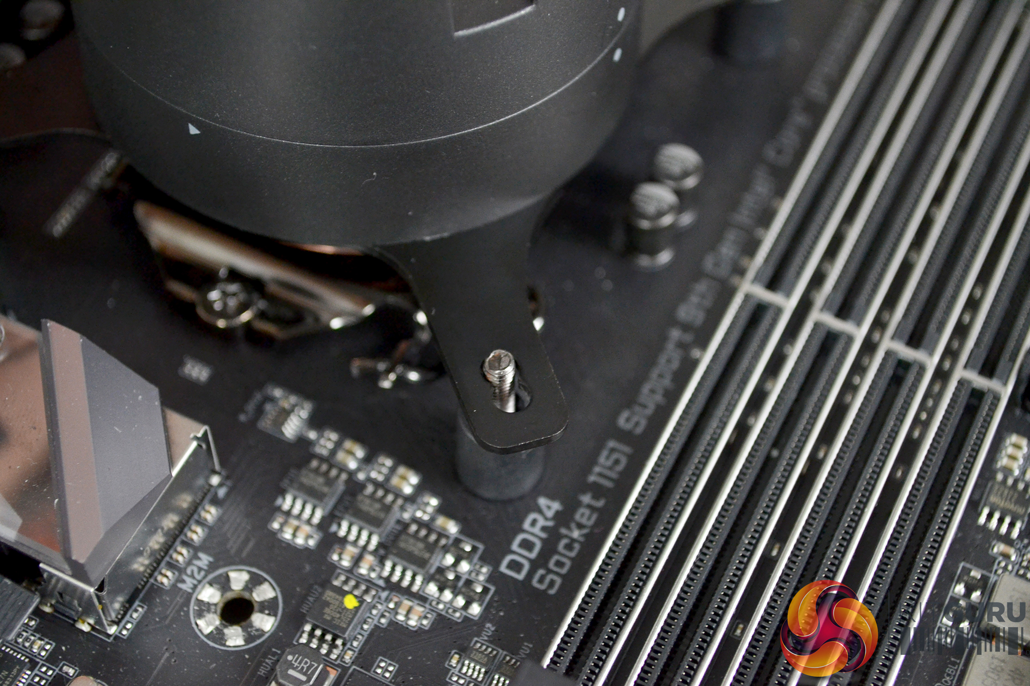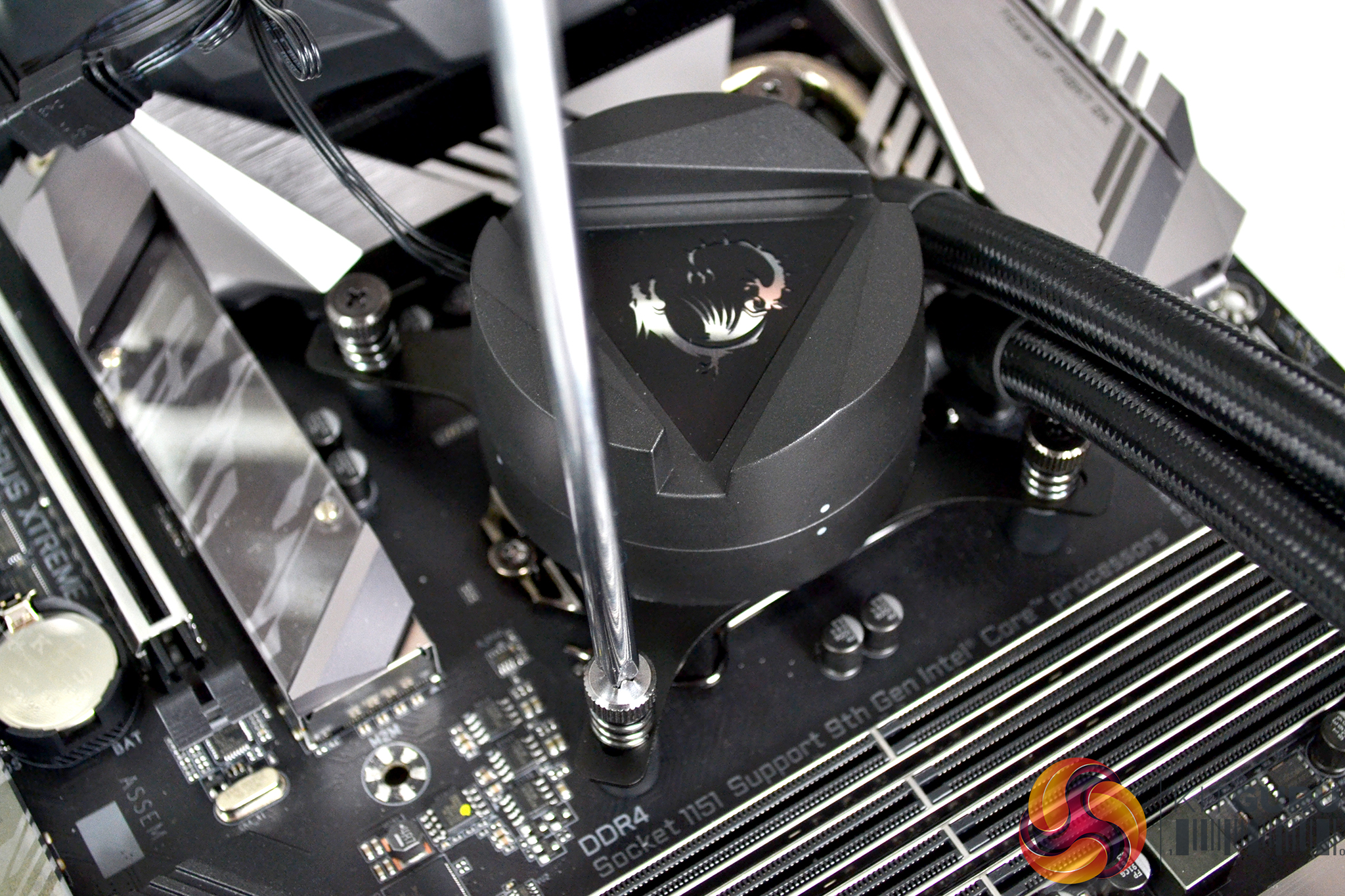 Once the thermal compound coating is applied, remove the protective label from the underside of the CPU block and lower the block down over the CPU with the holes in the upper mounting bracket aligned with the standoffs. Using the four spring-loaded thumbscrews, tighten the CPU block progressively in position in an X shape pattern to evenly spread the pressure across the CPU heat spreader for an optimal block to CPU contact.