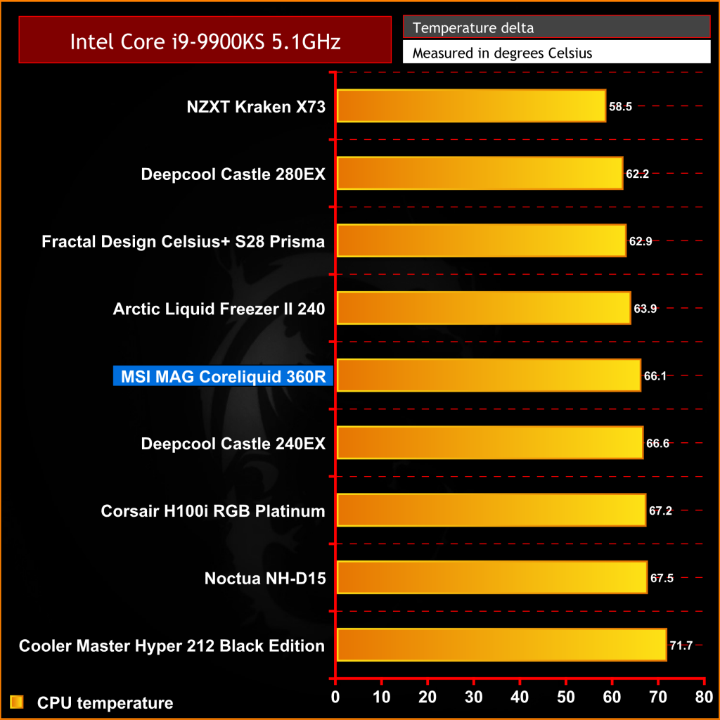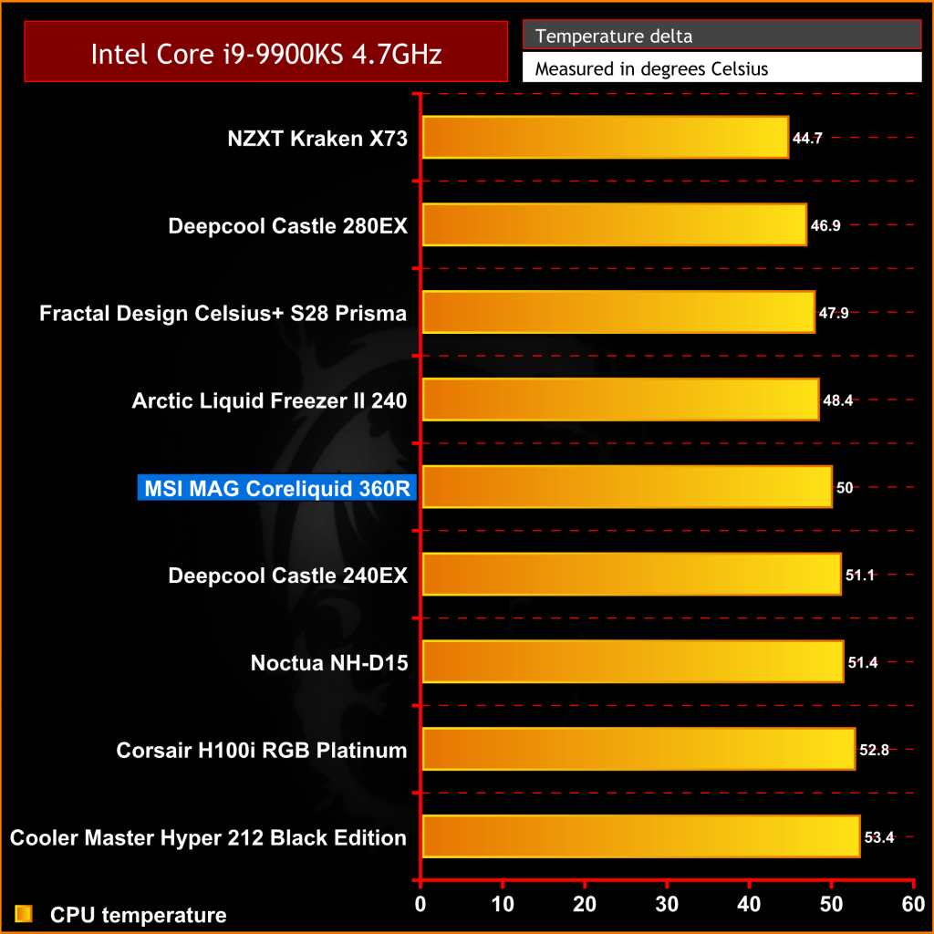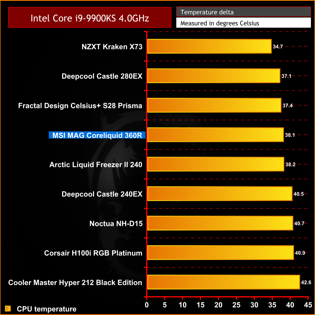 During our raw thermal performance tests with pump and fan speed set to maximum RPM, the MSI MAG CoreLiquid 360R gets off to a promising start when the Core i9-9900KS CPU is running at 4.0 GHz. However, as the CPU frequency is cranked up, performance tails off and becomes a little disappointing for an AIO of this size.
