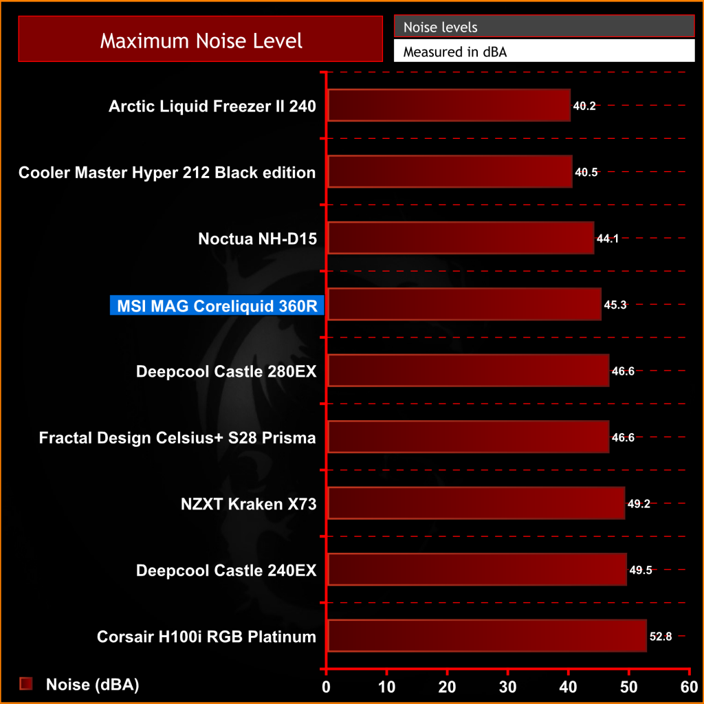 Maximum noise levels of the MSI MAG CoreLiquid 360R hit 45.3dbA with the fans and pump running at full speed. This noise level is audible but not distracting and is noticeably quieter than some other AIOs we have tested in the past, but still quite a way above the extremely low noise levels produced by the Arctic Liquid Freezer II.