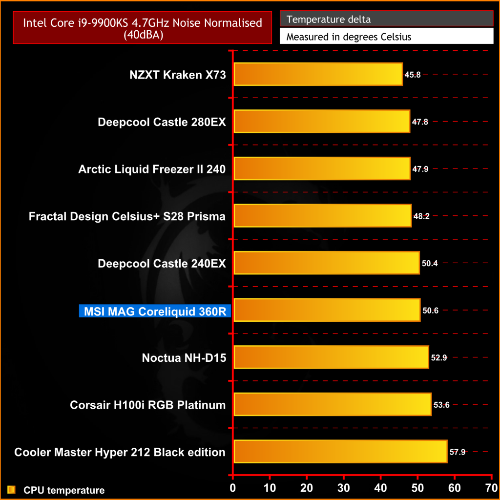 It is a similar result during our noise normalised test. When the noise output level of the coolers is equalised at 40dbA, the MAG CoreLiquid 360R struggles to show the performance of similar size AIO coolers we have previously tested. Even the smaller 240mm units from Arctic and Deepcool record better thermal performance than the CoreLiquid 360R which again is quite disappointing.