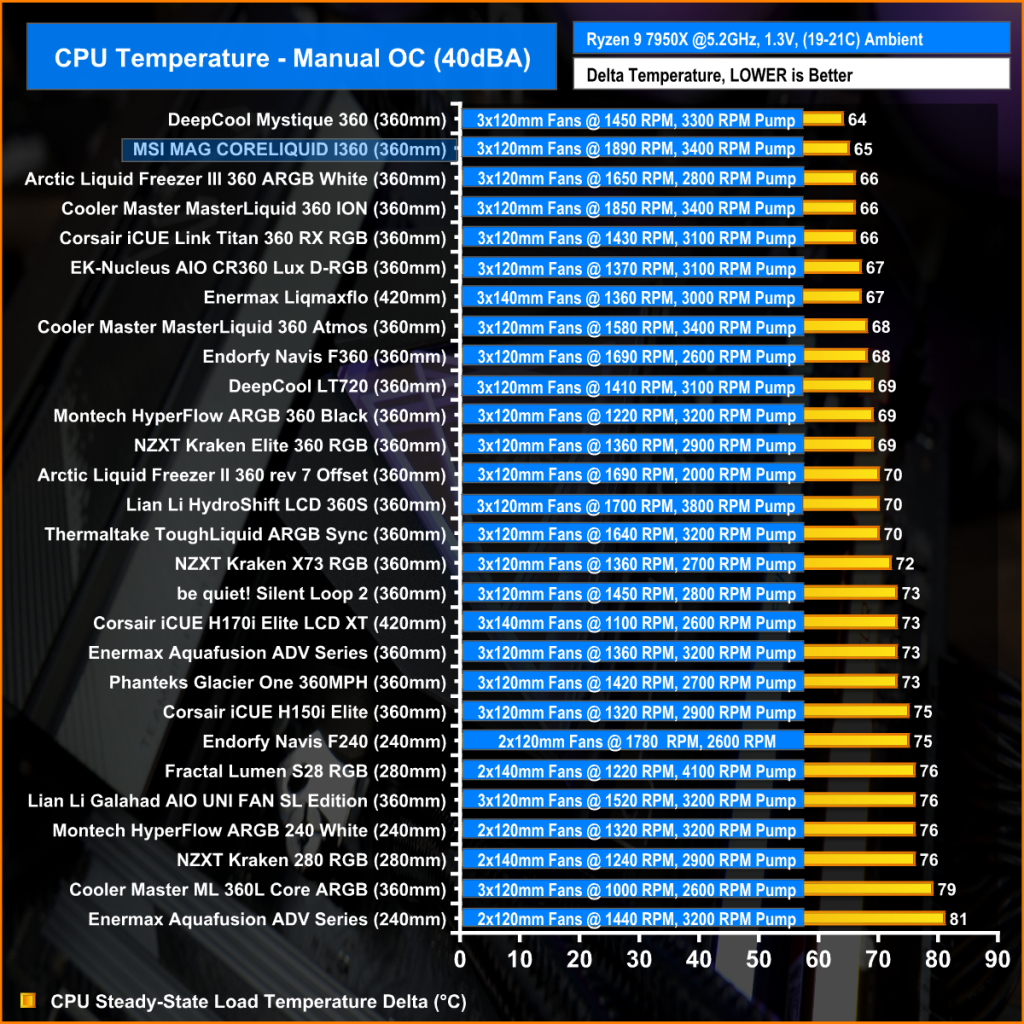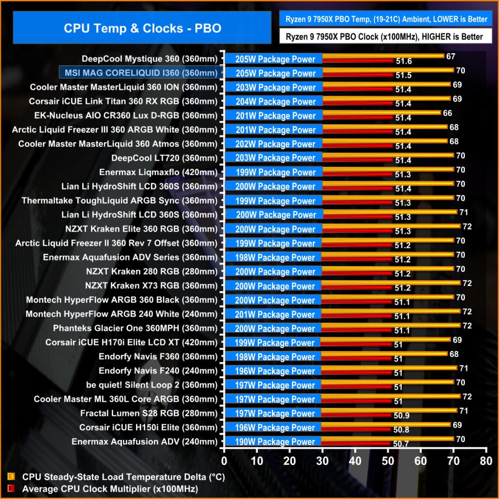 Again in the PBO test, the MSI MAG CoreLiquid I360 is a very strong contender, only marginally beaten to the top spot in our chart by the DeepCool Mystique 360. The CoreLiquid I360 manages to beat some more expensive competition, so it's very impressive overall.