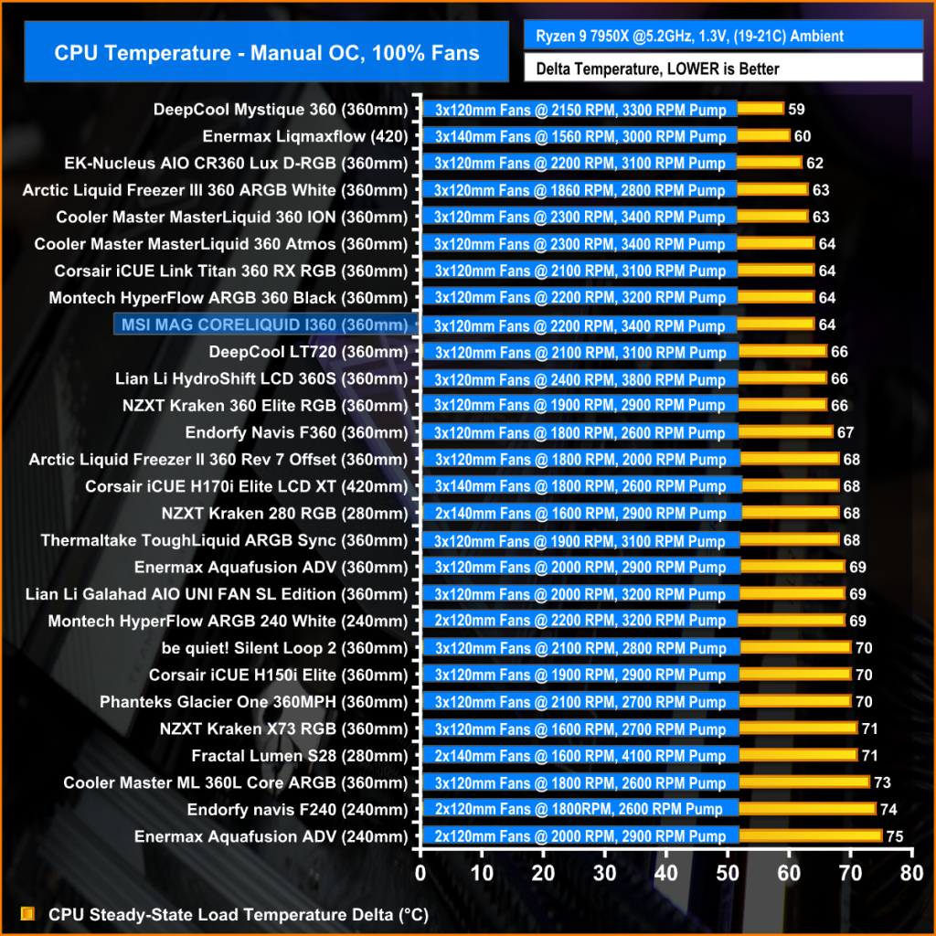 With fans running at max RPM the performance of the CoreLiquid I360 is up there with some of the top performers that we have tested previously on the 7950X. 64°C over ambient is a very respectable score, so at max fan speed the cooler has great performance.