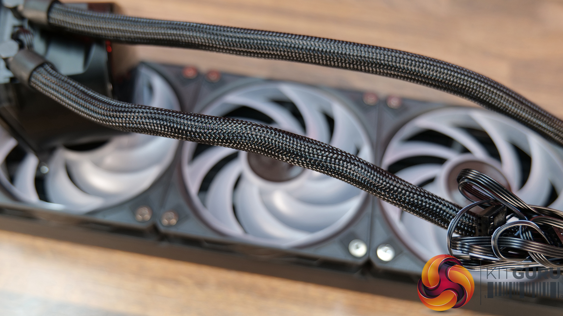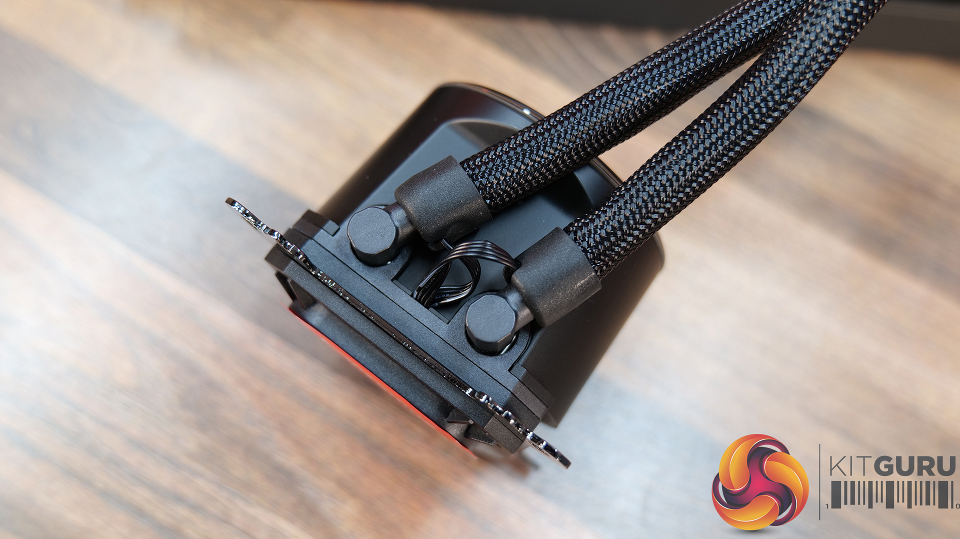 Flexible EPDM rubber tubing, 390mm long, connects to the CPU block on 90-degree rotary fittings, while the cold plate base is manufactured from micro-skived copper. All the wiring from the pump is routed inside the tube sleeve, which gives it a super clean look at the CPU block.